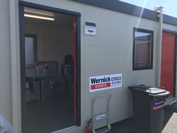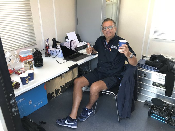 Olav Mol van Ziggo Sport aanwezig in de Formule 1-paddock op Silverstone. Vanaf de Grand Prix van Groot-Brittannië kan Ziggo Sport zodoende weer live vanaf locatie verslag doen van de Formule 1. Beide verslaggevers hebben een geheel eigen cabine waar ze in werken gedurende het weekend, zo laat Plooij zien op