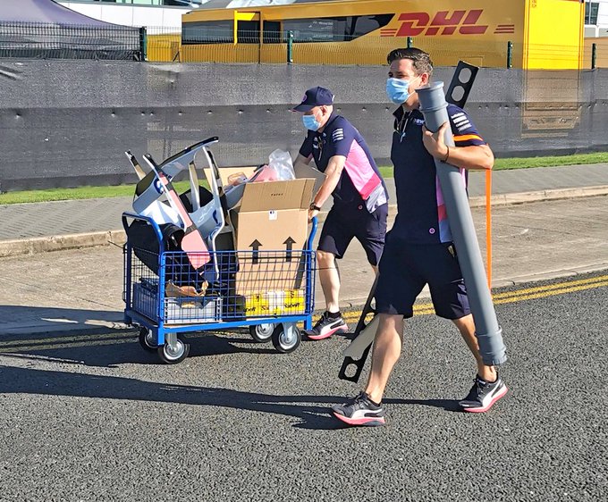 Een speciale levering uit de fabriek van Racing Point: monteurs brengen de spullen om het stoeltje in de RP20 van Sergio Pérez te vervangen. Na een positieve coronatest krijgen de 'roze Mercedessen' een vervanger, naar verluidt wordt dit Nico Hülkenberg.