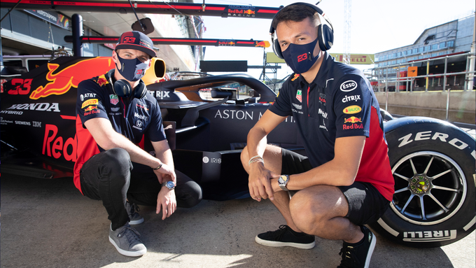 Max Verstappen en Alexander Albon poseren voor hun RB16: je zou bijna zeggen dat de twee Red Bull-coureurs bezig zijn met een debuut maken in de muziekwereld, en een album-cover uitbrengen..