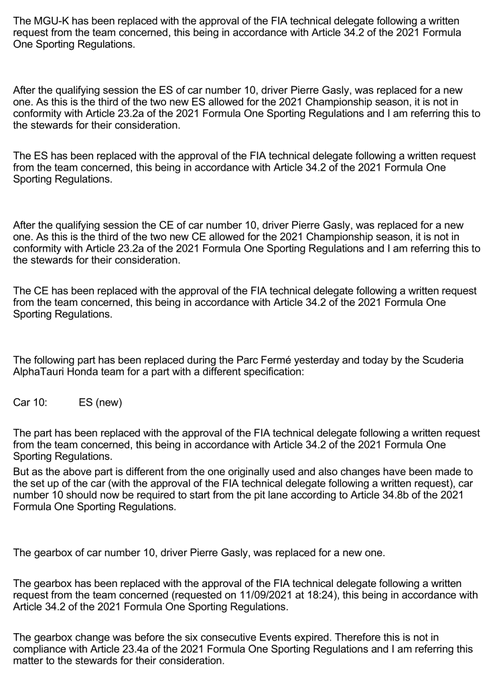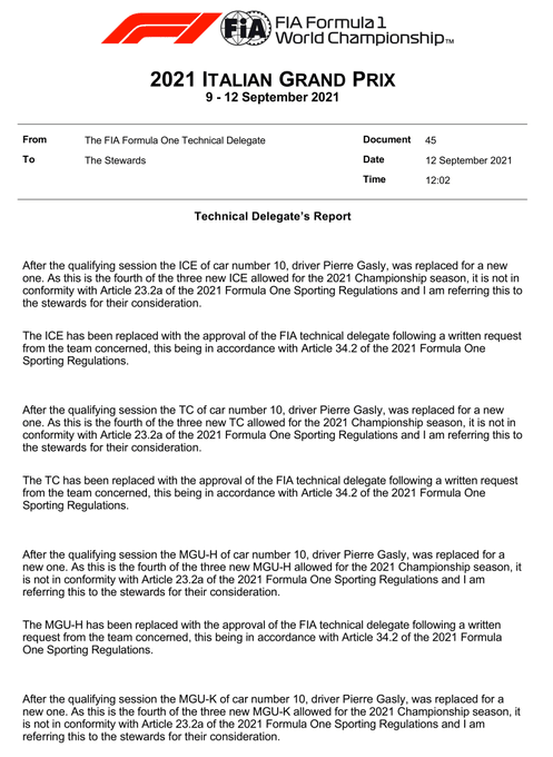 Pierre Gasly moet zondagmiddag vanuit de pitstraat starten, zo laat de FIA weten. AlphaTauri besloot na zijn crash in de sprintkwalificatie zijn motor en versnellingsbak te wisselen, om zo op een tactisch moment voor een extra motor te gaan. De Fransman start daarom niet vanaf P19, maar de pitstraat.