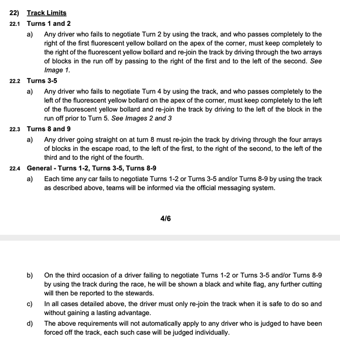 Daarnaast mag een coureur dit maar drie keer doen van de FIA. Een vierde keer wordt gelijk doorgestuurd naar de stewards, die een passende straf uitkiezen. Tijdens de kwalificatie worden vanzelfsprekend de tijden waarin coureurs een bocht afsnijden, verwijderd van het bord.
