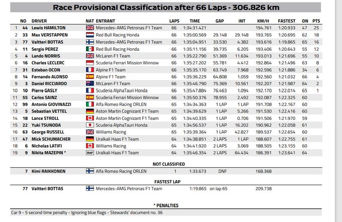 Lewis Hamilton heeft de Grand Prix van Portugal op zijn naam geschreven. De zevenvoudig wereldkampioen wist een wat matig begin van zijn race goed te maken en zowel Valtteri Bottas als Max Verstappen in te halen om al zijn 97ste overwinning in de Formule 1 te pakken. Ook Verstappen kon Bottas passeren voor de tweede plaats. Bottas eindigde op plaats drie, maar ging wel aan de haal met de snelste raceronde nadat deze van de Red Bull Racing-coureur werd afgepakt. Bekijk hieronder de volledige uitslag van de race.