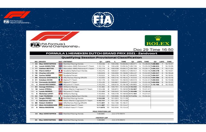 Max Verstappen pakte zaterdagmiddag op ijzersterke wijze poleposition voor de Grand Prix van Nederland. De coureur van Red Bull Racing was de hele dag al snel en wist zelfs met een kapotte DRS-vleugel een snellere tijd neer te zetten dan concurrent Lewis Hamilton. Teamgenoot Sergio Perez kon geen goede tijd neer zetten in Q1 en moest al vroeg afhaken. Bekijk hieronder de hele uitslag van de kwalificatie op