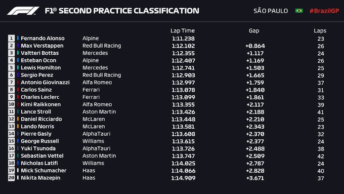 Fernando Alonso wist op knappe wijze de snelste tijd te klokken tijdens de tweede vrije training van de Grand Prix van Brazilië. Daarmee was hij Max Verstappen en Valtteri Bottas te slim af, die de top drie completeerden. Lewis Hamilton eindigde op P5 en kende geen ideale sessie, maar mocht zijn DRS ook niet gebruiken gedurende de sessie.
