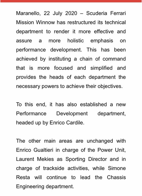 'Daarnaast staat deze herstructurering toe dat elke afdeling de kracht krijgt om de doelstellingen te behalen die voorgeschreven zijn. Om dit kracht bij te zetten hebben we ook een prestatieontwikkeling-afdeling opgezet die geleid zal worden door Enrico Cardile', aldus de woorden van de renstal uit Maranello.