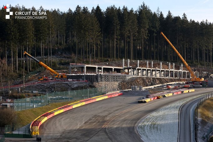 Hoewel het circuit in België er nog altijd uitziet als een bouwput, kunnen we al enige progressie spotten. Zo staat de basis van het grote tribunegebouw dat gebouwd gaat worden bij de legendarische Eau Rouge/Raidillon bochtencombinatie. Volgens het bouwplan is dit gebouw in april af en biedt het plaats voor 4600 toeschouwers en VIP-plaatsen.