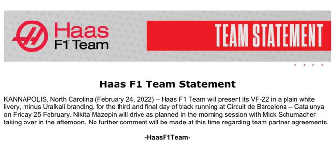 Haas neemt voor in ieder geval de derde testdag van het Formule 1-voorseizoen in Barcelona afstand van de Uralkali-livery. Dit vanwege de situatie in Oekraïne, dat in oorlog is met Rusland na een invasie van het laatstgenoemde land. Haas komt vrijdag in actie met een kale auto. In een statement meldt Haas specifiek dat het tijdens de derde testdag in Barcelona zonder de kleuren van Uralkali gaat rijden. Wat betreft de wintertests in Bahrein en de normale Formule 1-races is niet bekend wat Haas gaat doen met de livery. Het team wil verder geen commentaar geven, behalve dat