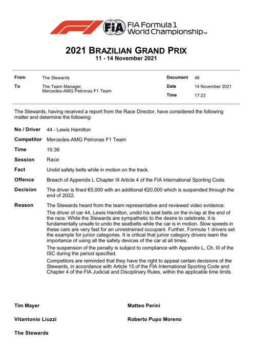 Wel is er nog voorwaardelijk 20.000 euro te spenderen aan de boete voor het einde van 2022. Hamilton koppelde zijn veiligheidsgordel los tijdens de uitloopronde om de Braziliaanse vlag te kunnen ontvangen van een marshal. De regel luidt dat de gordel ten alle tijden tijdens het rijden vast moet zitten. De Mercedes-coureur was dus in overtreding, maar ontkomt aan een sportieve straf die invloed had kunnen hebben op zijn resultaat. Hamilton won de Grand Prix van Brazilië voor Max Verstappen.