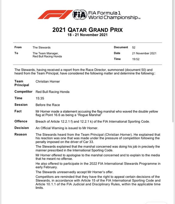 De stewards lieten om 18:00u Nederlandse tijd weten dat Horner er met een waarschuwing af is gekomen. Daarnaast laat men weten dat Horner tijdens de korte hoorzitting met de stewards aan heeft geboden om aanwezig te zijn bij de 'FIA International Stewards Programme' in 2022, een aanbod dat de stewards hebben aangenomen. Zodoende is er dus wel een 'zelfbedachte' straf die Horner moet ondergaan.