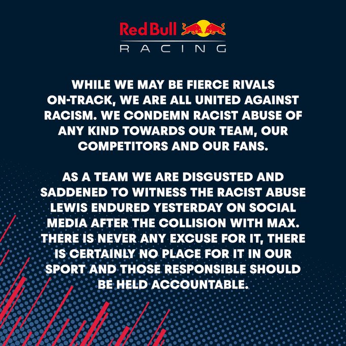 Red Bull brengt in een statement naar buiten verdrietig te zijn dat Lewis Hamilton racistisch bejegend is. Hoewel de teams op het circuit grote rivalen zijn, staan ze samen sterk in de strijd tegen racisme. Hamilton werd tijdens de GP van Groot-Brittannië racistisch bejegend op sociale media. Mercedes bracht al een statement naar buiten, waarin benadrukt werd dat racisme geen plaats heeft in de Formule 1. Verschillende teams hebben al aangegeven deze boodschap volledig te ondersteunen, waaronder nu dus ook Red Bull.
