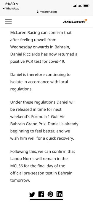 Omdat Ricciardo op de donderdag ziek was, nam teamgenoot Norris het stuur van hem over. Ook voor de tweede testdag was hij nog niet hersteld en zat zijn Britse collega achter het stuur. Nu bekend is dat de Australier in isolatie moet zal Norris ook de taken op zich nemen tijdens de laatste testdag in Bahrein.