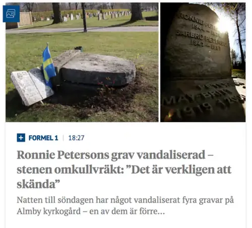 Op de Almby-begraafplaats in Örebro hebben vandalen op zondagavond stennis geschopt door van drie graven de zerken omver te trekken. Onder de getroffen graven bevond zich ook het graf van de Zweedse racelegende Ronnie Peterson die in de jaren zeventig furore maakte in de Formule 1, maar na de Italiaanse Grand Prix van 1978 overleed aan de gevolgen van een ernstig startongeluk.