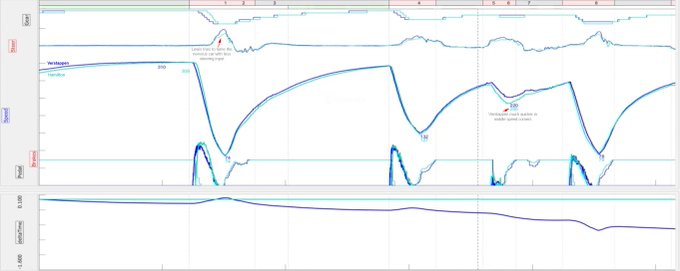 Hlawiczka bestudeert de telemetrie (gedetailleerde metingen van sensoren, red.) van de snelste rondes bij Verstappen en Hamilton. De