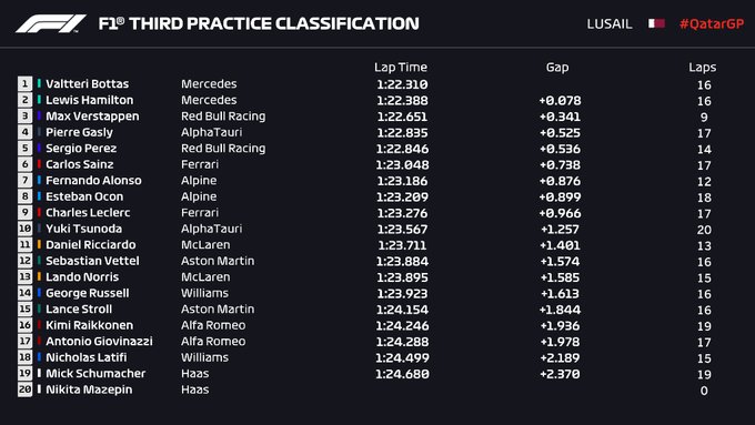 Mercedes heeft opnieuw een klap uit kunnen delen aan Red Bull Racing. De Duitse renstal was in de derde vrije training weer duidelijk de snelste op het Losail International Circuit. De achterstand van Max Verstappen op de snelste man was drie tienden. De snelste man van de derde vrije training was opnieuw Valtteri Bottas die met een tijd van 1:22,3 noteerde. Red Bull kampte ook deze training met problemen aan de achtervleugel. Beide Red Bull-coureurs stonden enige tijd in de garage zonder achtervleugel. De Oostenrijkse renstal kampt al sinds de Grand Prix van de Verenigde Staten met problemen aan het DRS-mechanisme. Ook op het Losail International Circuit, wat redelijk hobbelig is, klappert het bovenste gedeelte van de achtervleugel op en neer. Het team was in de pitbox waarschijnlijk bezig om het probleem te tackelen. Het team mag het DRS-mechanisme overigens niet vervangen, want daarvoor heeft het team al haar zogenaamde tokens voor verbruikt.