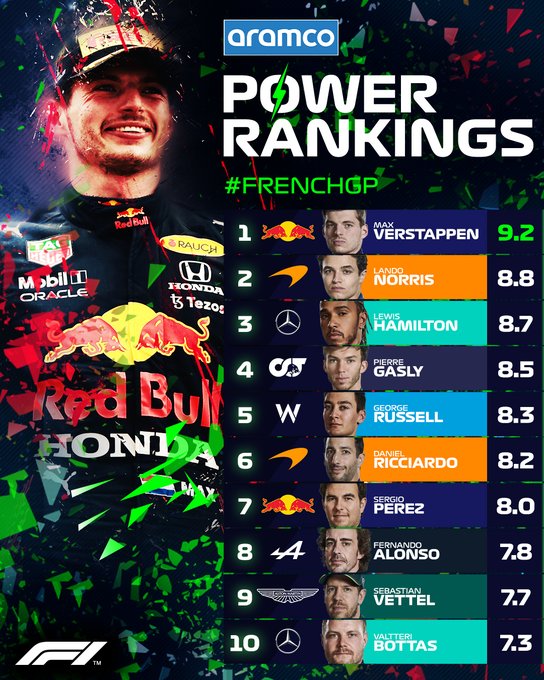 Max Verstappen behoudt de leiding in het Power Rankings-klassement dat wordt bijgehouden op de officiële website van de Formule 1. De Red Bull Racing-coureur kende een droomweekend in Frankrijk en troefde volgens de betrokken experts al zijn concurrenten af. Ook Lando Norris deed het goed op het circuit van Paul Ricard en Lewis Hamilton verdiende na twee tegenvallende straatraces weer een excellente score. Verstappen scoorde in Frankrijk een onofficiële hat-trick. Dat betekent dat hij de poleposition, overwinning en snelste raceronde op zijn naam schreef. Hij deed dat met een bijna feilloze executie van zijn twee-stop-strategie. 'Je kan daar geen ruzie over maken', schrijven de experts bij Formula 1. Het was genoeg voor een beoordelingscijfer van 9,2. Daarmee staat hij op plek 1 en behoudt hij de leiding in de 'Power Rankings'.