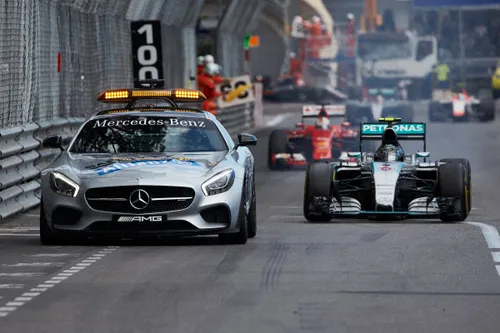 Nico Rosberg aan de leiding achter de safety car tijdens de Grand Prix van Monaco in 2015. Een zege op het stratencircuit hielp hem niet op weg naar de titel (Foto: Mercedes AMG F1).