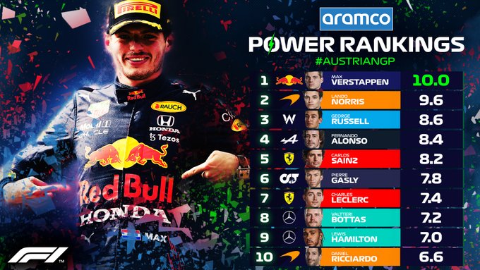 Max Verstappen heeft in de Formula 1 Power Rankings van deze week een perfecte score toegewezen gekregen. In de wekelijkse competitie, waarin alle coureurs aan de hand van zes juryleden een cijfer toegewezen krijgen, is het daarmee de Nederlander die, samen met Lando Norris, met kop en schouders boven de rest van het veld uitsteekt. 'Verstappen werd in Oostenrijk de vijfentwintigste coureur in de geschiedenis van de Formule 1 om een 'grand slam' te scoren, waarin hij poleposition pakte, de snelste raceronde, de overwinning en elke ronde aan kop reed. Het waren simpelweg twee heerlijke weekenden', aldus de zeskoppige jury, die zagen dat de Limburger geen stap fout zette gedurende het hele weekend op de