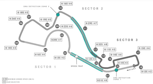 Ook de derde sector is wederom hoekig, met een haast rechthoekige laatste bochtencombinatie. Ook hier zijn alle bochten met de huidige Formule 1-auto's vrij snel, wat inhoudt dat geen enkele bocht normaliter in de tweede versnelling zal worden genomen aankomend weekend. Wat dat betreft zijn inhaalacties in langzame remzones dus niet van toepassing en is een goede exit richting start-finish van levensbelang om een inhaalactie te wagen op het rechte stuk richting bocht 2.
