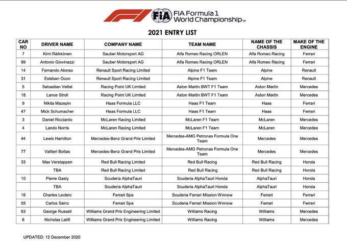 Zaterdagavond lekte een voorlopige versie van de zogeheten entry list voor 2021 uit, waarbij er nog onduidelijkheid heerst over de stoeltjes bij Red Bull Racing en AlphaTauri. Op de lijst ontbreken de namen van Daniil Kvyat en Alexander Albon, terwijl Mercedes Lewis Hamilton al op de lijst heeft gezet.