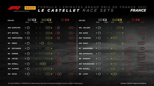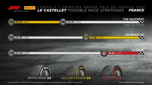 De strategische opties zullen beperkt zijn tijdens de Grand Prix van Frankrijk. Een één-stopper lijkt de meest effectieve optie te zijn voor alle coureurs. Echter, regenbuien kunnen hier verandering in gaan brengen. De verwachting is dat de meeste coureurs van de medium-band over zullen stappen naar de harde band.