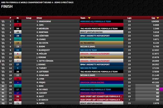 Al met al was het een race met veel inhaalacties, waarbij men niet bang was voor onderling contact. Hierdoor wisselde spektakel zich af met een aantal rommelige momenten. Hieronder vind je de volledige uitslag van de Rome ePrix: