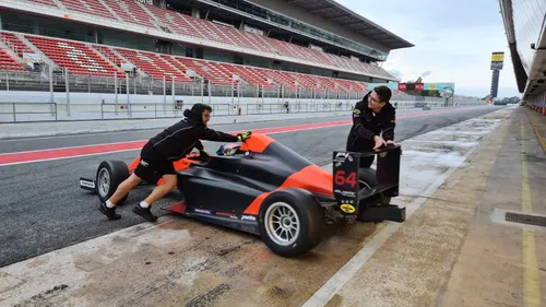 De MP Motorsport-bolide wordt naar binnen geduwd na een succesvolle test in Barcelona.