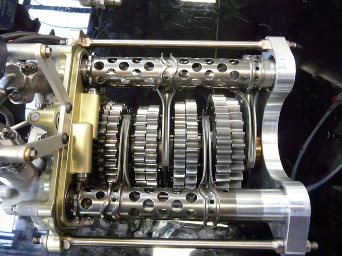 selector barrels, de buizen die in de afbeelding hieronder te zien zijn met gaten erin. Zo kunnen de bolides als het ware twee versnellingen tegelijk aandoen, zonder dat de vermogenslevering naar de coureur onderbroken wordt. Het is dus een systeem om vloeiend schakelen te accommoderen.